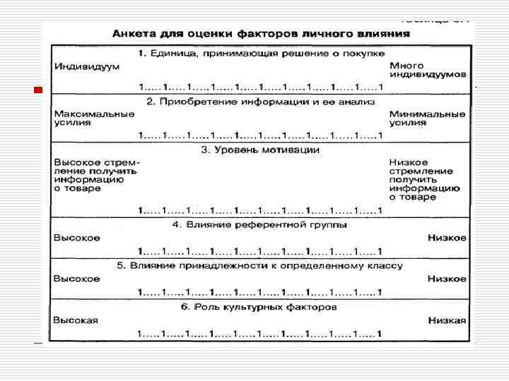 Факторы влияния на поведение потребителей. o Важно определить относительное влияние различных членов семьи на процесс совершения покупки. Выделяют четыре типа семей: o 1. Каждый член семьи принимает равное количество самостоятельных решений. o 2. Семьи, где муж принимает большую часть решений. o 3. Доминирование решений жены. o 4. Совместное принятие решений (синкретические).