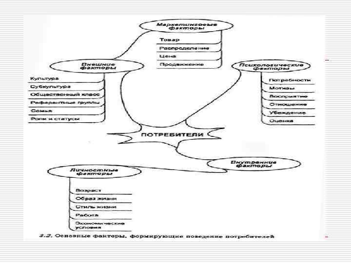 Факторы влияния на поведение потребителей. o Также важной характеристикой покупателя является o период жизненного цикла семьи. Выделено семь периодов: o 1) холостяцкий период, незамужний; o 2) молодые семьи; o 3) молодые семьи с ребенком в возрасте до 6 лет; o 4) молодые семьи с детьми в возрасте до 6 лет; o 5) супружеские пары, проживающие с несовершеннолетними детьми; o 6) пожилые пары, живущие отдельно от своих детей; o 7) престарелые одиночки.