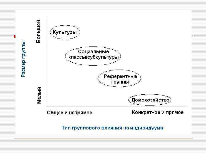 СОЦИАЛЬНЫЕ ФАКТОРЫ o Кроме культурных на потребительское поведение оказывают влияние такие социальные факторы, как референтные группы, семья, роли и статусы. Референтные группы. Референтная группа состоит из людей, которые оказывают прямое или косвенное влияние на отношение индивида к чему (кому)-либо и его поведение.