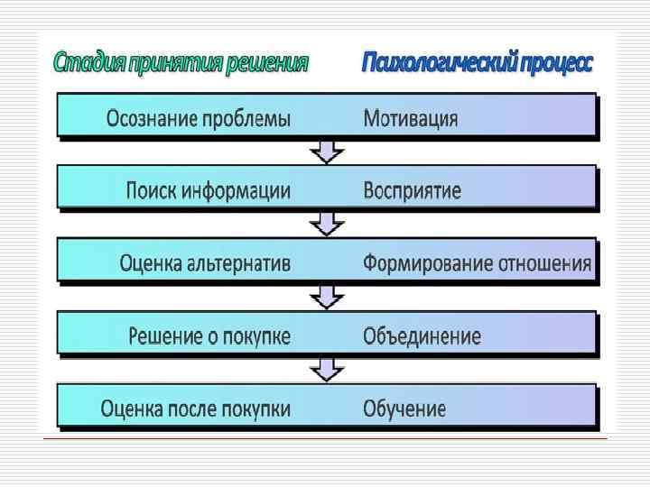 Процесс принятия решения потребителями o 5. Впечатления после покупки. Впечатление от приобретения товара может быть различным: от полного удовлетворения до совершенного негатива к данной покупке. Маркетолог должен сделать все, чтобы покупатель не разочаровался в своем выборе.