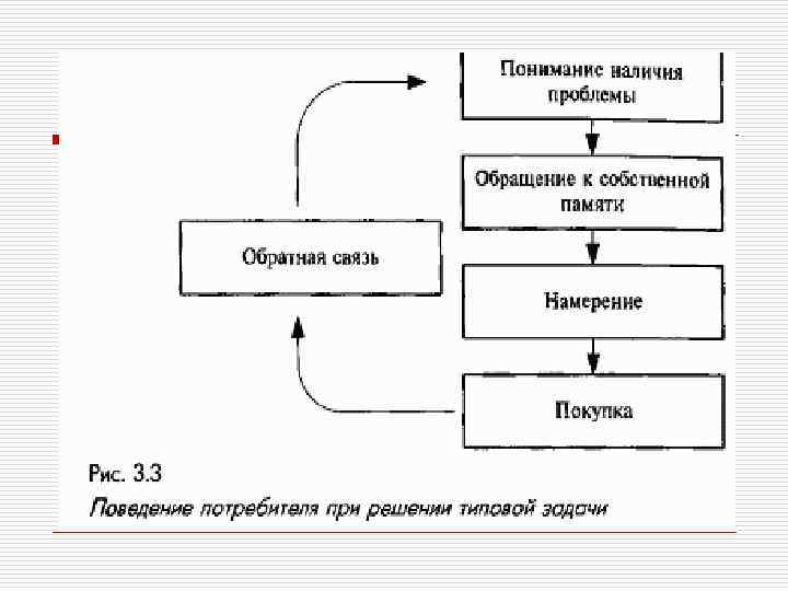 Процесс принятия решения потребителями. o Процесс приобретения того или иного товара включает в себя нижеперечисленные этапы. o 1. Возникновение потребности: потребность возникает под влиянием внешних и внутренних факторов. Для предприятия конкретных действий человеком его потребность должна достичь определенного уровня интенсивности, т. е. вытеснить или подавить другие желания. Специалист по маркетингу должен выяснить, какие свои потребности покупатель удовлетворяет, приобретая данный товар, а также с помощью каких мероприятий может быть повышена интенсивность потребности.