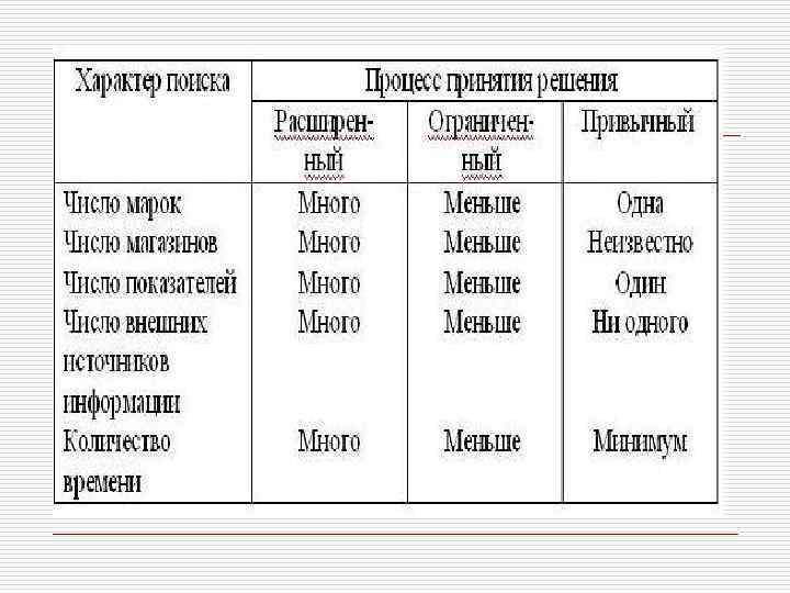 Процесс принятия решения потребителями. o 2. Поиск информации – человек ищет новые сведения при помощи внутреннего поиска или во внешней среде. Человек прежде всего обращается к себе, своему опыту и памяти. Он задает себе вопрос, сколько он знает о товаре, сколько объективно это мнение. Затем при неудовлетворенном ответе на вышеуказанные вопросы потребитель начинает искать внешние пути получения информации. Он может обратиться к точке зрения продавца товара, своих друзей, семьи. Она очень важна принятии решения и иногда даже играет решительную роль в конечном решении.
