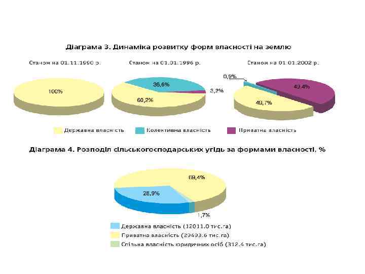 На початок 2003 року земельний фонд України складав 60, 4 млн гектарів. Значна частка земельної площі (69, 3% або 41, 8 млн га) – це сільськогосподарські угіддя, у структурі яких 78% (32, 5 млн га) припадає на ріллю.