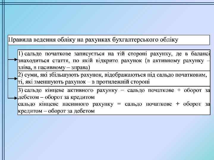 Відображення операцій на рахунках бухгалтерського обліку Правило АКТИВНІ РАХУНКИ 1 -ше – на активних рахунках враховуються всі активи підприємства або ресурси. 2 -ге – по дебету рахунку відображаються господарські операції, пов’язані з придбанням активу (збільшенням); – по кредиту рахунку відображаються господарські операції, пов’язані з вибуттям, використанням активу (зменшенням). 3 -тє – залишок на кінець місяця визначається розрахунковим шляхом: залишок на початок місяця по дебету + обороти по дебету – обороти по кредиту = залишок на кінець місяця по дебету. 4 -те ПАСИВНІ РАХУНКИ – капітал обліковується пасивних рахунках. на – по дебету рахунку відображаються господарські операції, пов’язані із зменшенням капіталу; – по кредиту рахунку відображаються господарські операції, пов’язані із збільшенням капіталу. – залишок на кінець місяця визначається розрахунковим шляхом. залишок на початок місяця по кредиту + обороти по кредиту – обороти по дебету = залишок на кінець місяця по кредиту. – залишок по активному рахунку – залишок на пасивному рахунку тільки по дебету. тільки кредитовий.