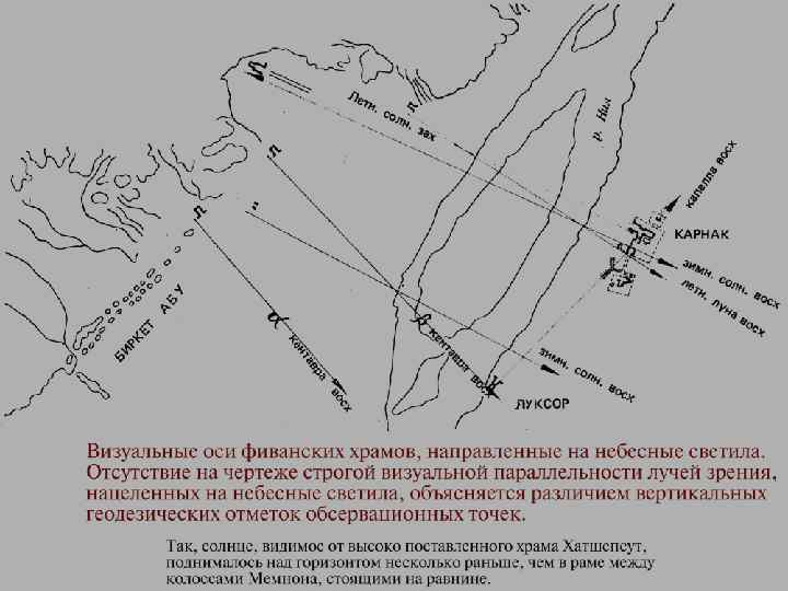 • • Структуру Фиванского ансамбля сформировала природная ситуация: русло Нила и Ливийская гряда. Русло Нила сформировало доминирующую в регионе продольную пространственную ось. Ливийская гряда с ее сложным контуром дала места формирования поперечных осей. На русло Нила, как доминирующую форму ориентирован главный храм Фив – храм Амона Ра в Карнаке. Пространственная ось, поперечная Нилу, связывает его с храмом Хатшепсут в Дейр эль Бахри. Вторая поперечная ось проходит через храм Амона в Луксоре и колоссы Мемнона. Следующая группа осей соединяет Карнакский храм Амона Ра с более мелкими храмами и храмом Амона в Луксоре