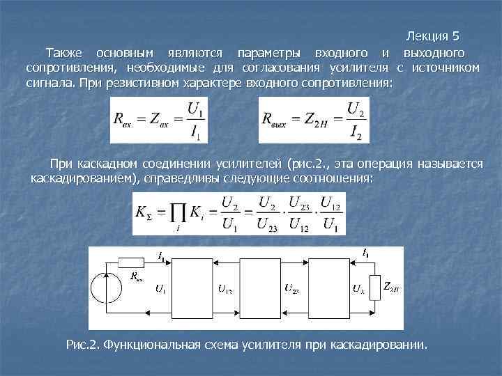 Лекция 5 Также основным являются параметры входного и выходного сопротивления, необходимые для согласования усилителя с источником сигнала. При резистивном характере входного сопротивления: При каскадном соединении усилителей (рис. 2. , эта операция называется каскадированием), справедливы следующие соотношения: Рис. 2. Функциональная схема усилителя при каскадировании.
