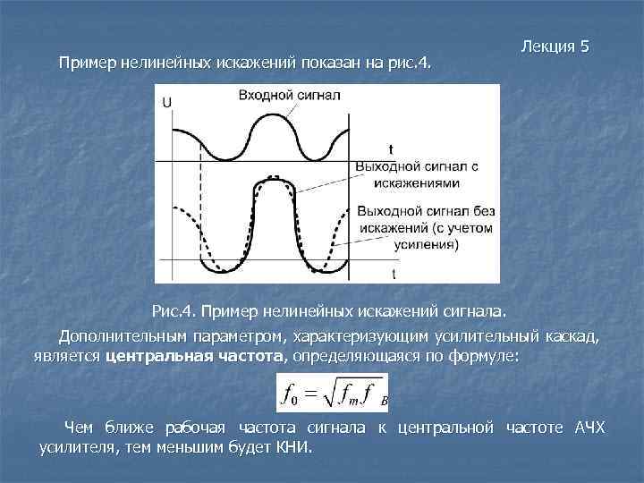 Пример нелинейных искажений показан на рис. 4. Лекция 5 Рис. 4. Пример нелинейных искажений сигнала. Дополнительным параметром, характеризующим усилительный каскад, является центральная частота, определяющаяся по формуле: Чем ближе рабочая частота сигнала к центральной частоте АЧХ усилителя, тем меньшим будет КНИ.