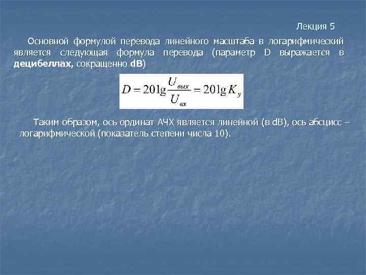 Лекция 5 Основной формулой перевода линейного масштаба в логарифмический является следующая формула перевода (параметр D выражается в децибеллах, сокращенно d. B) Таким образом, ось ординат АЧХ является линейной (в d. B), ось абсцисс – логарифмической (показатель степени числа 10).