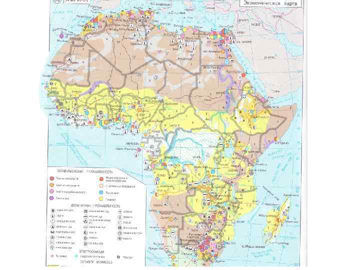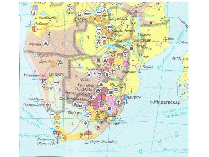 • Африка исключительно богата природными ресурсами. Особенно велики запасы минерального сырья — руд марганца, хромитов, бокситов и др. • В понижениях и прибрежных районах имеется топливное сырье. Нефть и газ добываются в Северной и Западной Африке (Нигерия, Алжир, Египет, Ливия). Колоссальные запасы кобальтовых и медных руд сосредоточены в Замбии и ДРК; марганцевые руды добываются в ЮАР и Зимбабве; платина, железные руды и золото — в ЮАР; алмазы — в Конго, Ботсване, ЮАР, Намибии, Анголе, Гане; фосфориты — в Марокко, Тунисе; уран — в Нигере, Намибии.