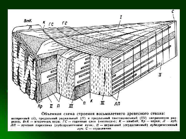 3. Анатомия многолетних стеблей с длительным вторичным утолщением l l l У древесных семейств растений камбиальное утолщение идет длительные годы. В центре ствола – древесина (до 90 % всего объема стебля). На поверхности древесины – тончайшая камбиальная зона и один слой инициальных клеток камбия. Наружу от камбия – вторичная кора: вторичная Фл (луб) + остатки первичной Фл и первичной коры + перидерма. Из наружных слоев вторичной коры развивается третичная ткань – корка.