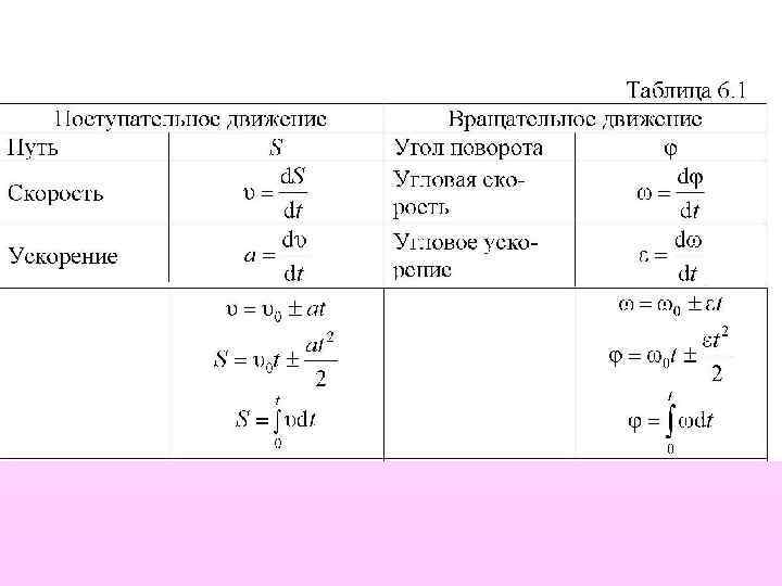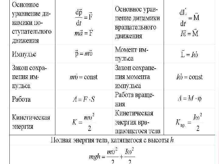 Сходство и различие линейных и угловых характеристик движения Формулы кинематики и динамики вращательного движения легко запоминаются, если сопоставить их с формулами поступательного движения. Отмечу, что в приведенной ниже таблице рассмотрены случаи движения с постоянными ускорениями: