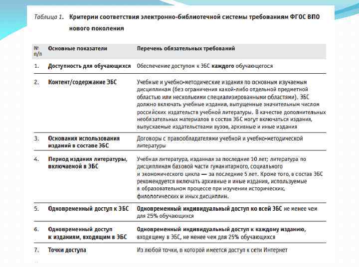 3. содержащая учебную литературу, изданную за последние 10 лет; литературу по дисциплинам базовой части гуманитарного, социального и экономического цикла — за последние 5 лет; 4. использующая издания на основании прямых договоров, заключенных с правообладателями; 5. обеспечивающая возможность осуществления одновременного индивидуального доступа ко всей системе не менее чем для 25 процентов обучающихся;