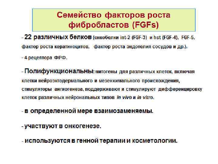 Установление функций FGFs с помощью нокаута генов Ген Нарушения в развитии FGF-1 Нет FGF-2 FGF-3 Небольшие нарушения развития мозга и регуляции кровяного давления, в заживлении ран Нет FGF-4 Нарушение дорзально-вентрального паттернирования FGF-5 Увеличение роста волос FGF-6 Нарушения в формировании скелетных мышц