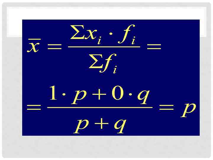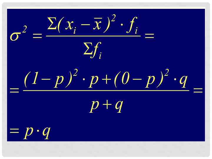 1 - значение признака для единиц совокупности, обладающих изучаемым свойством единиц, обладающих р - доля изучаемым свойством 0 - значение признака для единиц совокупности, необладающих q - доля единиц, необладающих изучаемым свойством