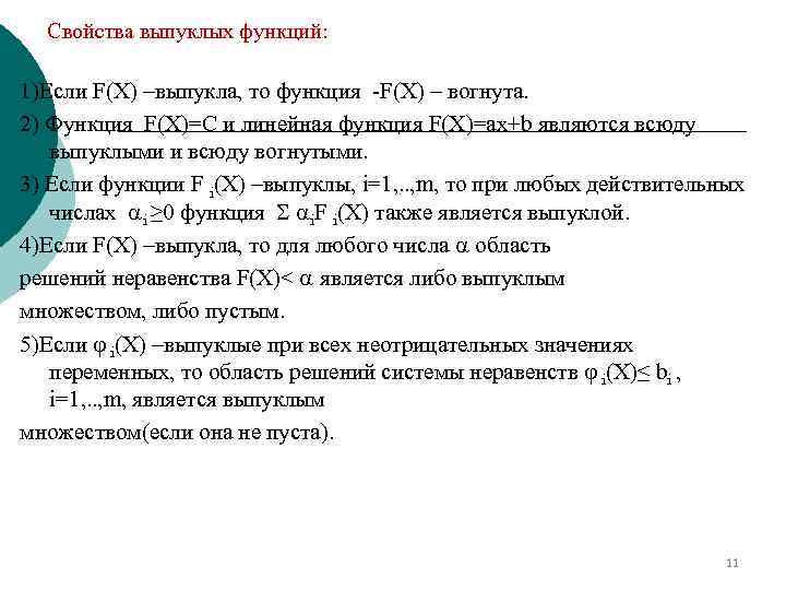 Задача выпуклого программирования ¡ ¡ ¡ Дана система неравенств вида: gi(x 1, x 2, …, хn)≤bi , i=1, 2, . . , m (1) Z=f(x 1, x 2, …, хn ) (2) Функции gi(x 1, x 2, …, хn) являются выпуклыми на выпуклом множестве М, а функция Z либо выпукла на множестве М, либо вогнута. Задача выпуклого программирования состоит в отыскании такого решения системы (1), при котором (выпуклая) функция (2) достигает минимального значения , или вогнутая функция Z достигает максимального значения. 10