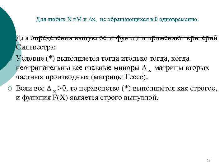 Свойства выпуклых функций 6) Выпуклая (вогнутая) функция, определённая на выпуклом множестве М, непрерывна в каждой внутренней точке этого множества. 7) Всякая дифференцируемая строго выпуклая (вогнутая) функция имеет не более одной стационарной точки (т. е. точки, в которой равны нулю все частные производные). Для выпуклой (вогнутой) функции стационарная точка является точкой локального и глобального минимума (максимума). 8)Дважды дифференцируемая функция F(X)=F(x 1, . . Xn ) является выпуклой в том случае, когда 12