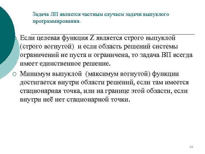 Задача ЛП является частным случаем задачи выпуклого программирования. ¡ ¡ Если целевая функция Z является строго выпуклой (строго вогнутой) и если область решений системы ограничений не пуста и ограничена, то задача ВП всегда имеет единственное решение. Минимум выпуклой (максимум вогнутой) функции достигается внутри области решений, если там имеется стационарная точка, или на границе этой области, если внутри неё нет стационарной точки. 14