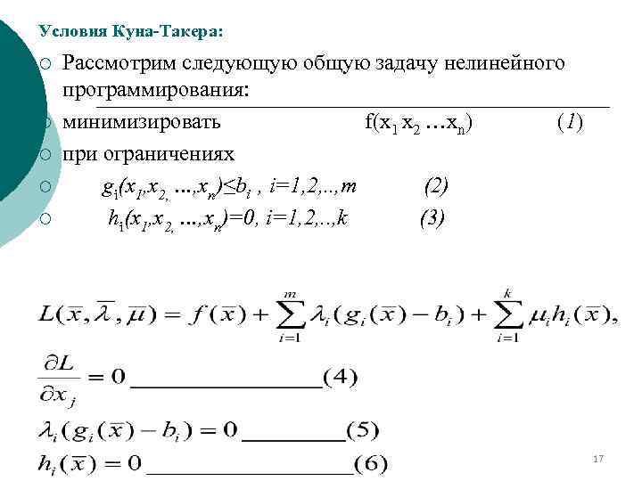 Условия Куна-Такера: ¡ Необходимые условия минимума функции ¡ f(x 1, x 2, …, хn ) с условиями: gi(x 1, x 2, …, хn)≤bi ¡ имеют вид: ¡ 16