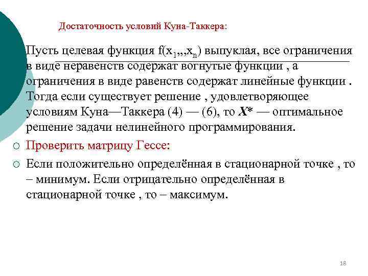 Условия Куна-Такера: ¡ ¡ ¡ Рассмотрим следующую общую задачу нелинейного программирования: минимизировать f(x 1 x 2 …xn) (1) при ограничениях gi(x 1, x 2, …, хn)≤bi , i=1, 2, . . , m (2) hi(x 1, x 2, …, хn)=0, i=1, 2, . . , k (3) 17