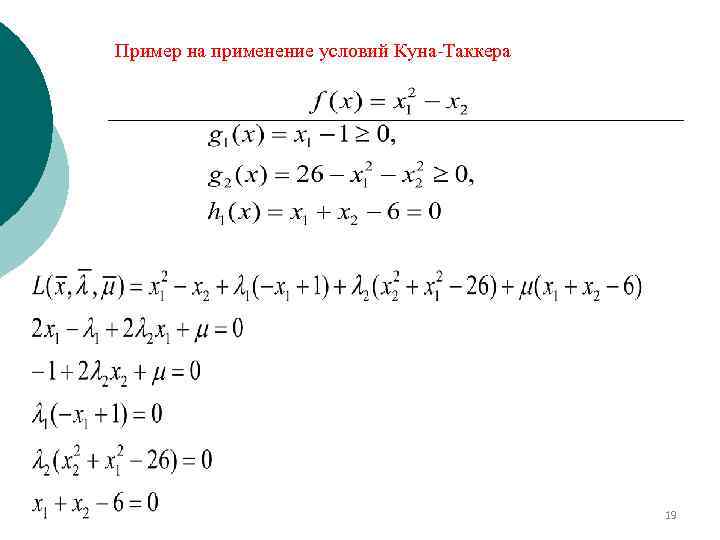 Достаточность условий Куна-Таккера: ¡ ¡ ¡ Пусть целевая функция f(x 1, , , xn) выпуклая, все ограничения в виде неравенств содержат вогнутые функции , а ограничения в виде равенств содержат линейные функции. Тогда если существует решение , удовлетворяющее условиям Куна—Таккера (4) — (6), то X* — оптимальное решение задачи нелинейного программирования. Проверить матрицу Гессе: Если положительно определённая в стационарной точке , то – минимум. Если отрицательно определённая в стационарной точке , то – максимум. 18