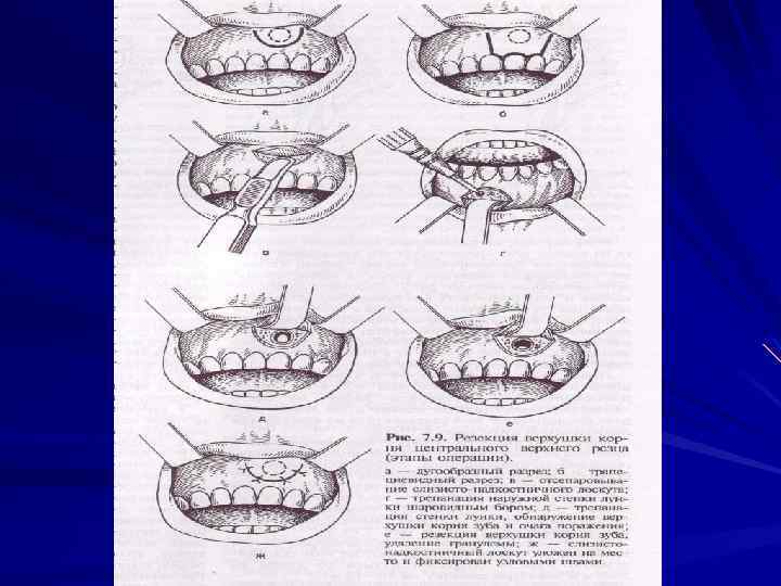 Хирургические методы лечения хронических периодонтитов Удаление зуба Реплантация зуба Резекция верхушки корня зуба Гемисекция Ампутация корня Коронорадикулярная сепарация Аутотрансплантация