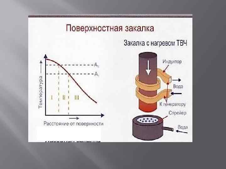 Поверхностная закалка стали: а – распределение температур по сечению; б – структура при поверхностном нагреве; в – структура после закалки