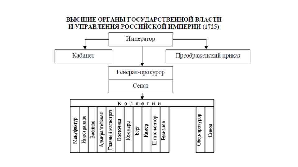 4. 2. Государственного управления и территориально-административная реформа. В 1708 г. в России началась территориально-административная реформа. Территория страны была поделена на 8 губерний. Во главе их были поставлены губернаторы. С 1719 г. губернии были разделены на 47 провинций, которые в свою очередь делились на дистрикты. Под руководством губернаторов создавался разветвленный административно-бюрократический аппарат, требовавший немалых дополнительных денег. В 1711 г. по приказу Петра был создан Сенат, ставший высшим органом по де-лам законодательства и управления. В 1718 г. приказная система государственного управления была заменена коллегиями, которые были организованы по отраслевому принципу.