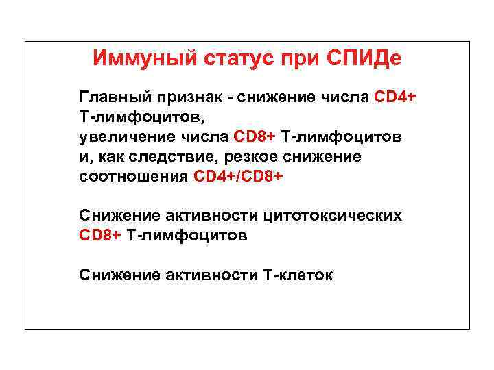 Иммуный статус при СПИДе Главный признак - снижение числа CD 4+ T-лимфоцитов, увеличение числа CD 8+ Т-лимфоцитов и, как следствие, резкое снижение соотношения CD 4+/CD 8+ Снижение активности цитотоксических CD 8+ Т-лимфоцитов Снижение активности Т-клеток