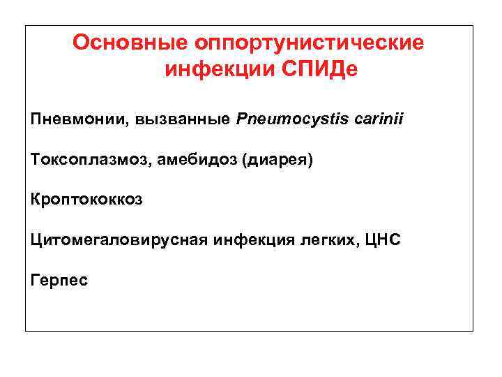 Основные оппортунистические инфекции СПИДе Пневмонии, вызванные Pneumocystis carinii Токсоплазмоз, амебидоз (диарея) Кроптококкоз Цитомегаловирусная инфекция легких, ЦНС Герпес