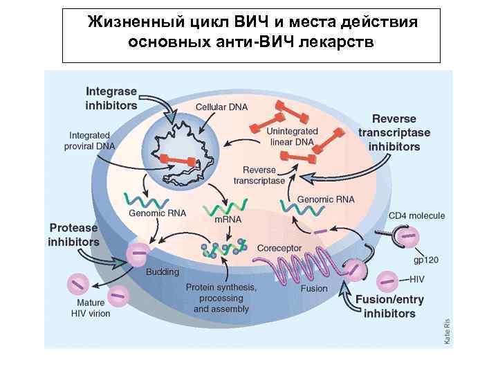 Жизненный цикл ВИЧ и места действия основных анти-ВИЧ лекарств