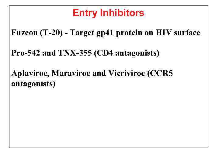 Entry Inhibitors Fuzeon (T-20) - Target gp 41 protein on HIV surface Pro-542 and TNX-355 (CD 4 antagonists) Aplaviroc, Maraviroc and Vicriviroc (CCR 5 antagonists)
