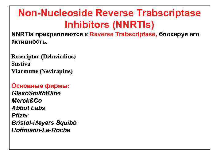 Non-Nucleoside Reverse Trabscriptase Inhibitors (NNRTIs) NNRTIs прикрепляются к Reverse Trabscriptase, блокируя его активность. Rescriptor (Delavirdine) Sustiva Viarmune (Nevirapine) Оснoвные фирмы: Glaxo. Smith. Kline Merck&Co Abbot Labs Pfizer Bristol-Meyers Squibb Hoffmann-La-Roche