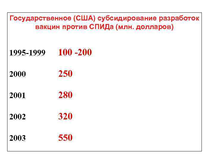 Государственное (США) субсидирование разработок вакцин против СПИДа (млн. долларов) 1995 -1999 100 -200 2000 250 2001 280 2002 320 2003 550