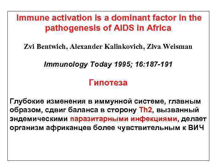 Immune activation is a dominant factor in the pathogenesis of AIDS in Africa Zvi Bentwich, Alexander Kalinkovich, Ziva Weisman Immunology Today 1995; 16: 187 -191 Гипотеза Глубокие изменения в иммунной системе, главным образом, сдвиг баланса в сторону Th 2, вызванный эндемическими паразитарными инфекциями, делает организм африканцев более чувствительным к ВИЧ