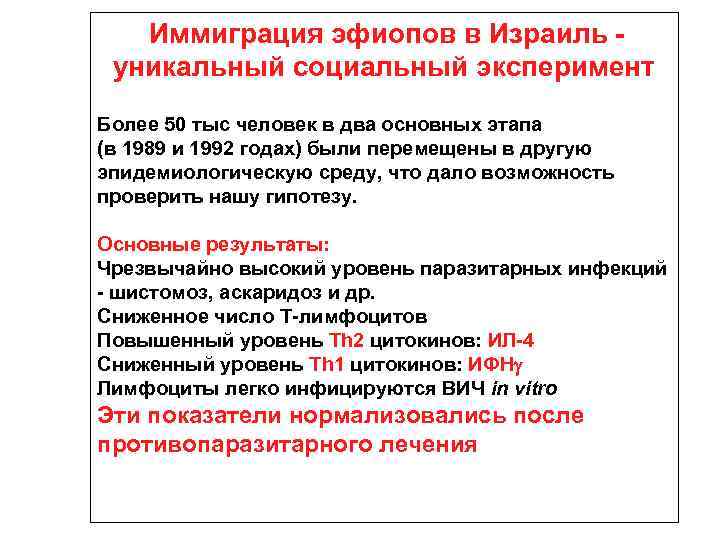 Иммиграция эфиопов в Израиль уникальный социальный эксперимент Более 50 тыс человек в два основных этапа (в 1989 и 1992 годах) были перемещены в другую эпидемиологическую среду, что дало возможность проверить нашу гипотезу. Основные результаты: Чрезвычайно высокий уровень паразитарных инфекций - шистомоз, аскаридоз и др. Сниженное число Т-лимфоцитов Повышенный уровень Th 2 цитокинов: ИЛ-4 Сниженный уровень Th 1 цитокинов: ИФНg Лимфоциты легко инфицируются ВИЧ in vitro Эти показатели нормализовались после противопаразитарного лечения