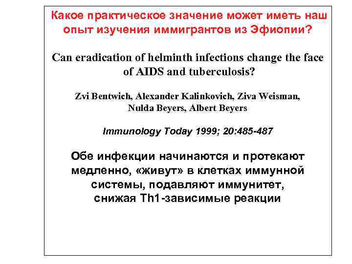 Какое практическое значение может иметь наш опыт изучения иммигрантов из Эфиопии? Can eradication of helminth infections change the face of AIDS and tuberculosis? Zvi Bentwich, Alexander Kalinkovich, Ziva Weisman, Nulda Beyers, Albert Beyers Immunology Today 1999; 20: 485 -487 Обе инфекции начинаются и протекают медленно, «живут» в клетках иммунной системы, подавляют иммунитет, снижая Th 1 -зависимые реакции