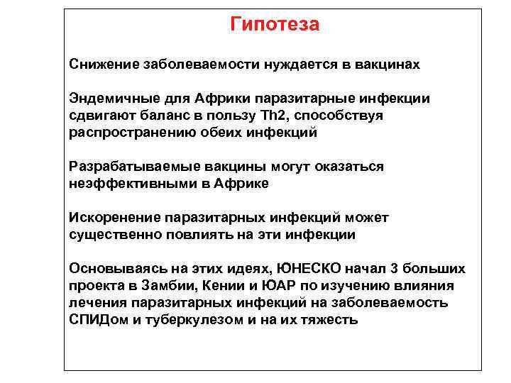 Гипотеза Снижение заболеваемости нуждается в вакцинах Эндемичные для Африки паразитарные инфекции сдвигают баланс в пользу Th 2, способствуя распространению обеих инфекций Разрабатываемые вакцины могут оказаться неэффективными в Африке Искоренение паразитарных инфекций может существенно повлиять на эти инфекции Основываясь на этих идеях, ЮНЕСКО начал 3 больших проекта в Замбии, Кении и ЮАР по изучению влияния лечения паразитарных инфекций на заболеваемость СПИДом и туберкулезом и на их тяжесть
