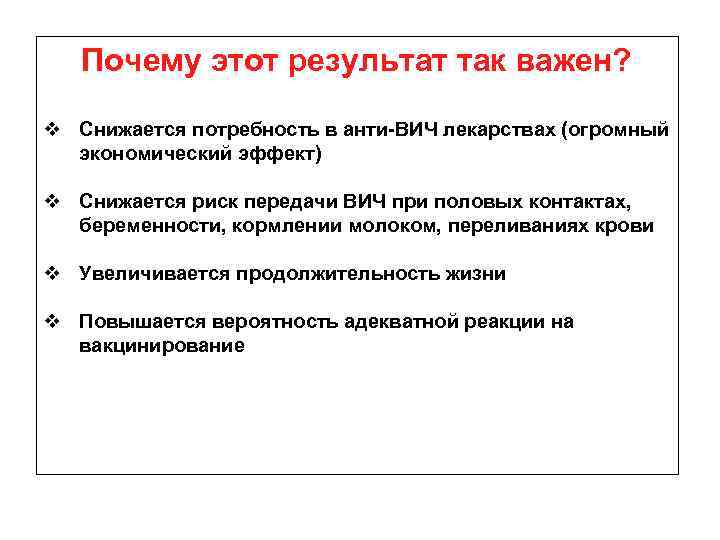 Почему этот результат так важен? v Снижается потребность в анти-ВИЧ лекарствах (огромный экономический эффект) v Снижается риск передачи ВИЧ при половых контактах, беременности, кормлении молоком, переливаниях крови v Увеличивается продолжительность жизни v Повышается вероятность адекватной реакции на вакцинирование