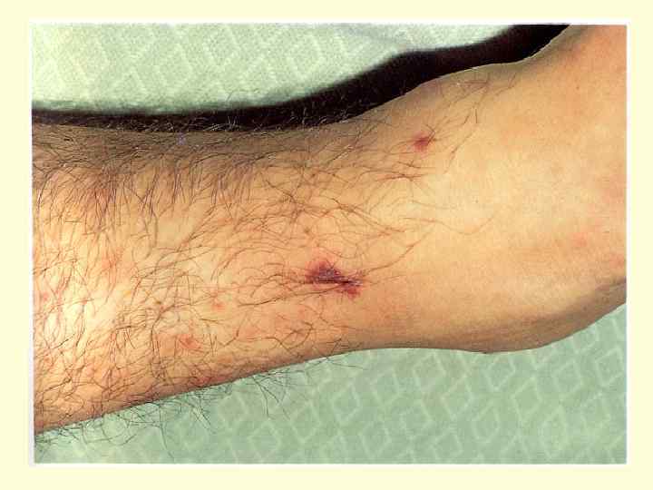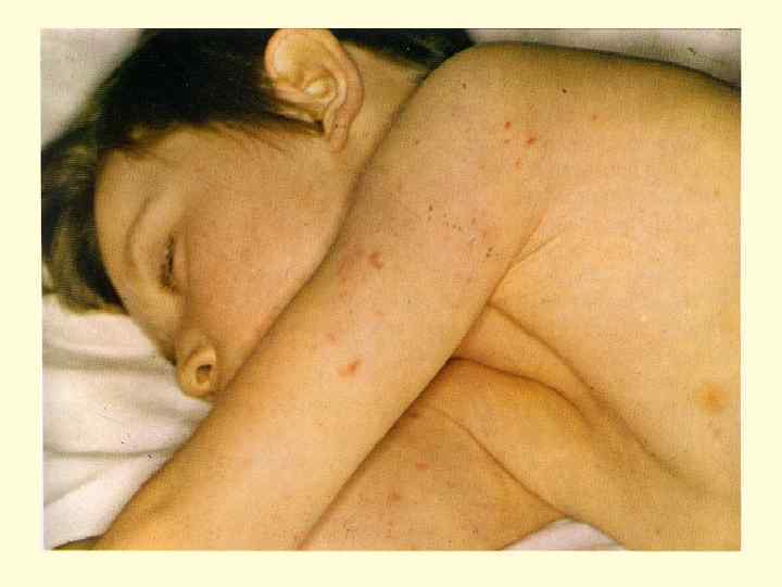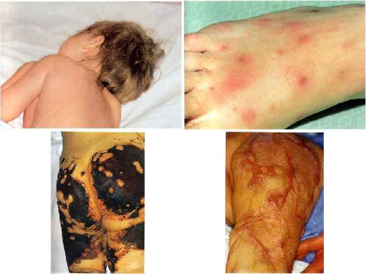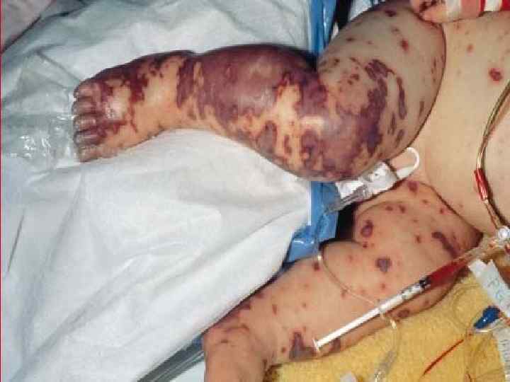 МЕНИНГОКОККОВЫЙ СЕПСИС: - острое начало с ознобом и быстрым повышением температуры до 38 40 гр. С; - лихорадка интермитирующая, снижается при ухудшении состояния (проявление ИТШ); - выраженная интоксикация (головная боль, жажда слабость, бледность и сухость кожи); - появление признаков геморрагического синдрома: появление геморрагической сыпи с некрозом на коже ягодиц, бедер, голенях, туловище, рук, век уже спустя 6 часов от начала заболевания !!! - энантема на переходной складке конъюктив, кровоизлияния в склеры; - кровоизлияния в суставы 5 – 13% чаще пальцев рук и ног, реже поражаются крупные суставы; - общие проявления геморрагического синдрома – носовые, маточные, внутренние кровотечения;