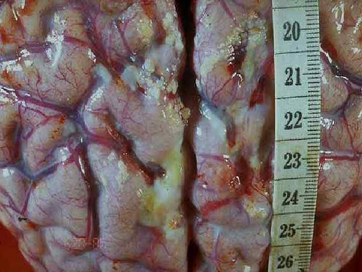 МЕНИНГИТ - внезапное начало ( помнят час своего заболевания ) - высокая лихорадка; - интенсивная головная боль в области затылка; - рвота, которая не приносит облегчения; - гиперестизии, гиперакузия, фотофобия; - появление и нарастание выраженности менингеальных симптомов (регидность мышц затылка, Кернига, Брудзинского и т. д. ); - поражение ЧМН : - 3 -4 пары (диплопия, птоз, анизокория); - 7 -8 пары (12, 7% )– поражение слухового нерва с последующим снижением слуха у 6% больных - в СМЖ - нейтрофилов больше 1000 в 1 мкл у 83% увеличение белка и падение уровня глюкозы.