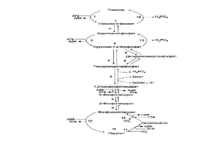 Необратимые реакции гликолиза • 1. образование глюкозы из Гл-6 -Ф • 2. образование фруктозы из Фр-6 -Ф • 3. образование фосфоенолпирувата из пирувата