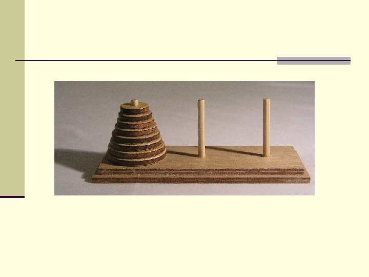 Ханойская башня n Ханойские Башни —это головоломка, которую в 1883 г. придумал французский математик Эдуард Люка. n есть три стержня и восемь дисков разных диаметров, вначале все диски собраны на одном стержне так, что меньшие диски лежат на больших. Люка предлагал переложить все диски с первого стержня на третий, используя второй. При этом следует соблюдать следующее правило: диски можно перекладывать с одного стержня на другой, при этом нельзя класть диск поверх диска меньшего радиуса.