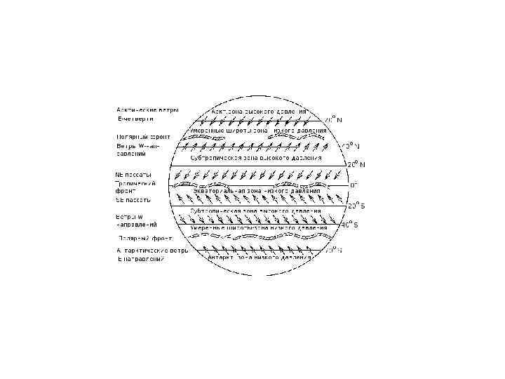с. ш. 80° 60 30 10 30 60 80° ю. ш. 1014 1012 1019 1012 1010 1012 1018 989 991 • Итак, зональность в распределении давления на уровне моря (и в нижней тропосфере) сложнее, чем в распределении температуры. Температура у земной поверхности непрерывно падает от низких широт к высоким (если не учитывать влияние распределения суши и моря). • Давление же от экваториальной зоны сначала растет к субтропикам, затем падает к субполярным широтам и снова растет к полюсам. • При этом меридиональный барический градиент направлен от субтропиков к экватору, от субтропиков же к субполярным широтам и от полюса к субполярным широтам; • направление барического градиента, таким образом, несколько раз меняется вдоль меридиана. • С этим согласуется и зональное распределение ветра.