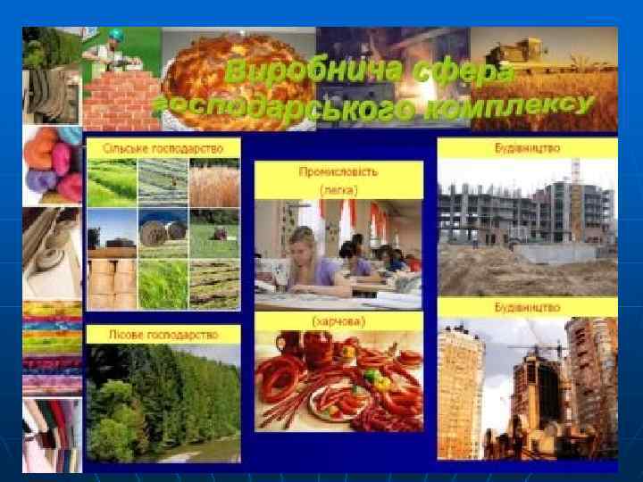 Виробнича сфера n n n складається з окремих ланок (народногосподарських галузей), це промисловість, сільське господарство, будівництво та ін. Сектори (ланки) виробничої сфери поділяють на галузі – крупні і вузькі (напр. , промисловість складається з металургійної, хімічної, машинобудівної, сільське господарство – з рослинництва і тваринництва.
