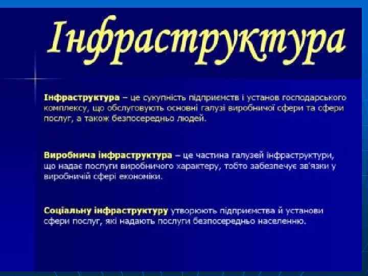 Основні риси господарства України (2) n n n n екстенсивний розвиток сільськогосподарського виробництва з недосконалими системами землеробства; недостатній розвиток рекреаційного комплексу, що не відповідає значному рекреаційному потенціалу країни; недостатній розвиток ринкової, виробничої, соціальної та екологічної інфраструктури; слабкий розвиток інноваційного комплексу; низька забезпеченість паливно-енергетичними, водними та лісовими ресурсами; застарілість технологій та зношеність основних виробничих фондів; недостатнє використання сировинної бази (у т. ч. відходів), зокрема, у будівництві.