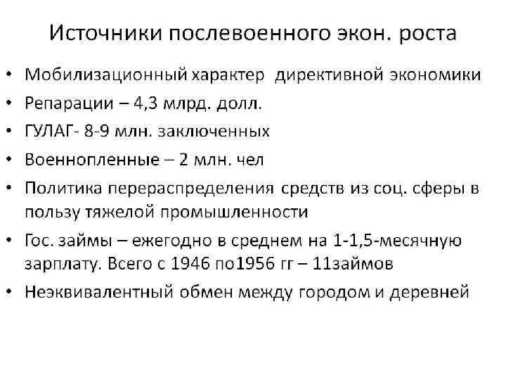 Модели социально-экономического развития капиталистических стран в межвоенный период Либеральный реформизм ( «Новый курс» в США 1933 -1939 гг. , Англия в 1930 -е гг. ): • Государственное регулирование финансовой системы (укрепление системы государственных банков), кредиты частным предприятиям. • Вмешательство государства в отношения между трудом и капиталом, поощрение организации рабочих в профсоюзах, ограничение всевластия бизнеса. • Создание новых рабочих мест, проведение общественных работ. Социальный реформизм (Народные фронты во Франции и Испании в 1936 -19389 гг. ): • Государственное регулирование финансовой системы, выкуп государством нерентабельных частных предприятий, создание государственных и смешанных компаний • Проведение государственной политики в интересах и по требованиям основных производителей (рабочие, крестьяне, служащие). Широкая социальная политика. «Корпоративизм» (фашистская Италия, нацистская Германия): • Частный бизнес развивается, но подчиняется интересам государства. Создание корпораций, руководимых государственными агентами, по заданиям правительства. Выпуск государственных облигаций для стимулирования экономики. • «Межклассовый мир» : создание системы искусственного погашения социальных конфликтов, за счет полного подчинения всех граждан националистическому государству • Социальная политика, направленная на «этатизацию» и «мобилизацию» человека • Милитаризация экономики, принудительный труд дополняет вольный (концлагеря) Командно-административный социализм (СССР): • Планирование (пятилетки) • Вся собственность, за исключением личной, находится под контролем государства • Социальная политика, направленная на «этатизацию» и «мобилизацию» человека • Милитаризация экономики, сверхиндустриализация, велика роль принудительного труда (ГУЛАГ)