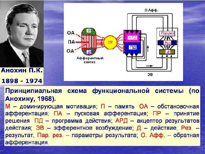Русский физиолог Петр Кузьмич Анохин также пришел к необходимости пересмотра классических представлений о рефлекторной дуге как основе всякой психичес кой деятельности. Петр Кузьмич Анохин (1898 1974) Он создал теорию функциональных систем. Согласно этой теории, физиологическую основу психической деятельности составляют не отдельные рефлексы, а включение их в сложную систему, которая обеспечивает выполнение целенаправленного действия, поведения. Эта система существует столько, сколько необходимо для их выполнения. Она возникает для выполнения определенной задачи, определенной функции. Поэтому такая система и названа функциональной. М доминирующая мотивация; П память; ОА обстановочная афферентация; ПА пусковая афферентация; ПР принятие решения; ПД программа действия; АРД акцептор результатов действия; ЭВ эфферентное возбуждение; Д действие; Рез. результат, Пар. рез. параметры результата; О. афф. обратная афферентация