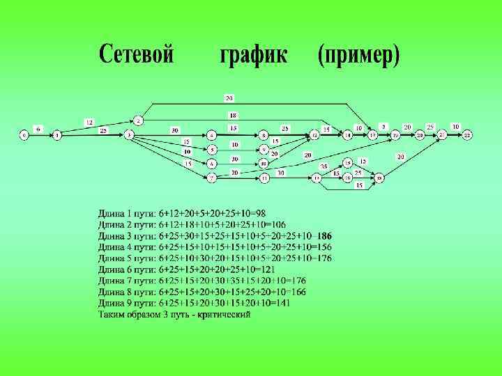 В сетевом графике важно понятие пути. Взаимосвязанные между собой работы и события на сетевом графике образуют пути. Любая последовательность работ или цепь по направлению стрелок образует путь. Если путь начинается в исходном событии и заканчивается завершающим событием, то такой путь называется полным. В каждом сетевом графике можно выделить несколько полных путей. Продолжительность пути определяется суммой продолжительности составляющих его работ. Полный путь с максимальной продолжительностью работ называется критическим путем. Работы этого пути называются критическими; их продолжительность определяет конечный срок выполнения комплекса операций.