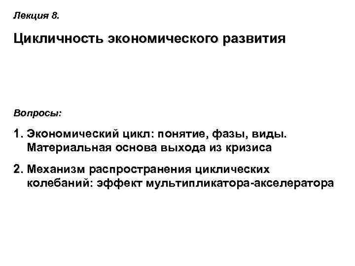 Лекция 8. Цикличность экономического развития Вопросы: 1. Экономический цикл: понятие, фазы, виды. Материальная основа выхода из кризиса 2. Механизм распространения циклических колебаний: эффект мультипликатора-акселератора