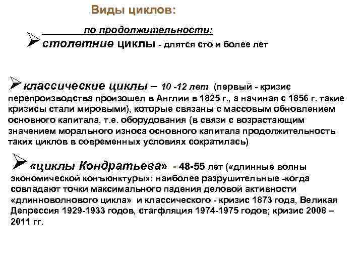 Виды циклов: по продолжительности: Øстолетние циклы - длятся сто и более лет Øклассические циклы – 10 -12 лет (первый - кризис перепроизводства произошел в Англии в 1825 г. , а начиная с 1856 г. такие кризисы стали мировыми), которые связаны с массовым обновлением основного капитала, т. е. оборудования (в связи с возрастающим значением морального износа основного капитала продолжительность таких циклов в современных условиях сократилась) Ø «циклы Кондратьева» - 48 -55 лет ( «длинные волны экономической конъюнктуры» : наиболее разрушительные -когда совпадают точки максимального падения деловой активности «длинноволнового цикла» и классического - кризис 1873 года, Великая Депрессия 1929 -1933 годов, стагфляция 1974 -1975 годов; кризис 2008 – 2011 гг.